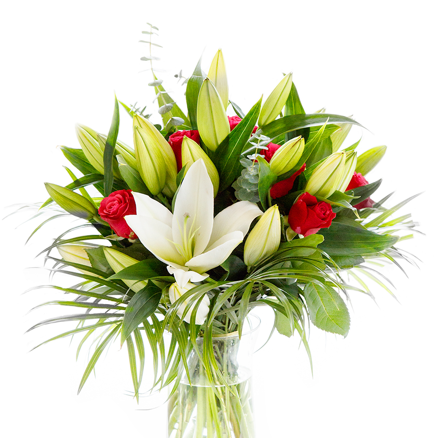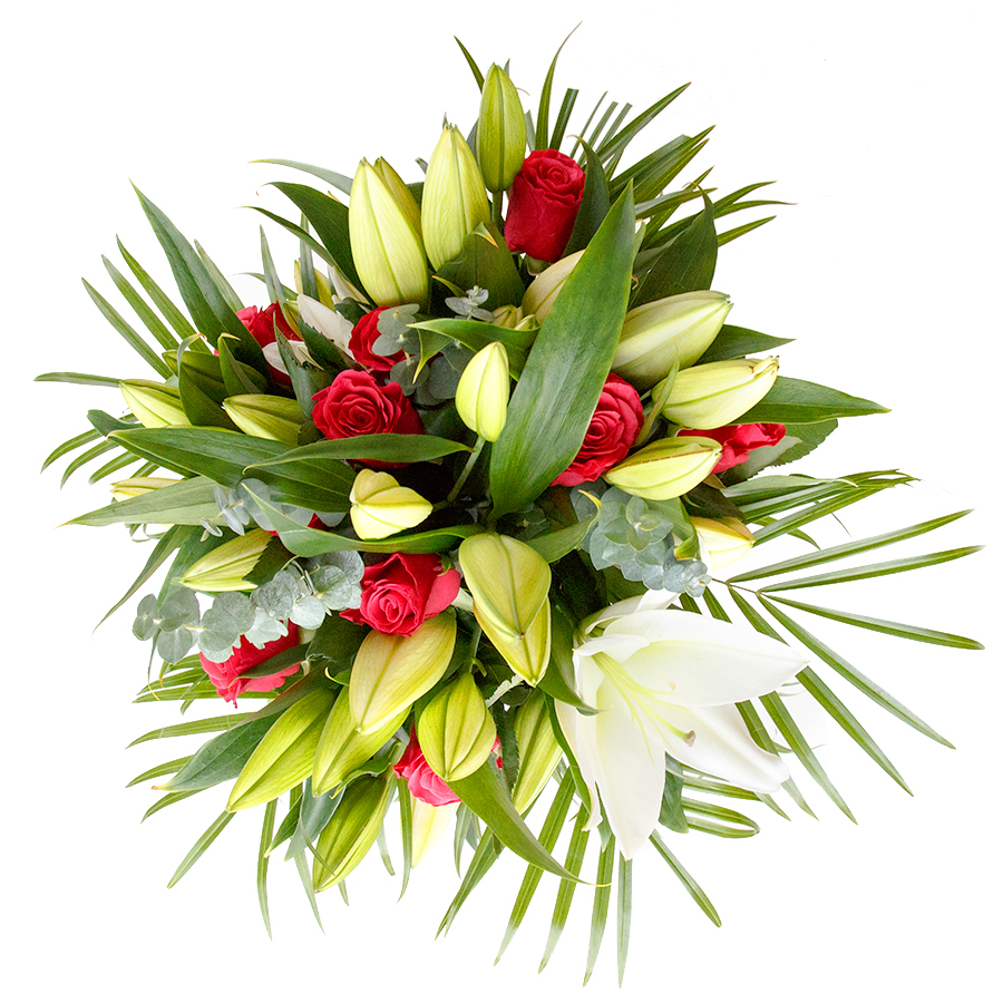 This glorious hand-tied bouquet is not only feminine but stylish as well. This is achieved by the selection of White Oriental Lilies, complemented with velvet red roses, salal and palm leaves.